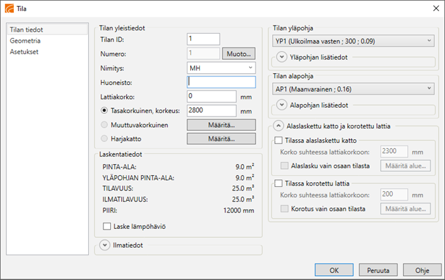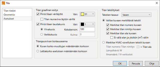Toiminto laskee huoneen pinta-alan ja tuo ruudulle Tila–dialogin, jossa voidaan asettaa huoneen tiedot kuten nimitys, huoneisto jne.
