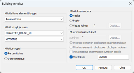 Ruudulle avautuu dialogi, johon syötetään mitoituksen tapa. Valitse mitoitettavaksi elementtityypiksi Aukkomitoitus. Mitoitustyyliksi valitaan OSAMITAT_HOUSE_50 ja tasoksi MITOITUS. Mitoitustyyppinä käytetään perusmitoitusta. Mitoitetaan ensin vaakamitat, joten valitaan suunnaksi Vaaka. Viitetekstiksi voidaan kirjoittaa AUKOT.