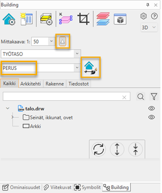 Valitse Building-ikkunan pudotusvalikosta aktiiviseksi mitoitustyyliksi Osamitat_House_50 -mitoitustyyli (oletuksena PERUS).
