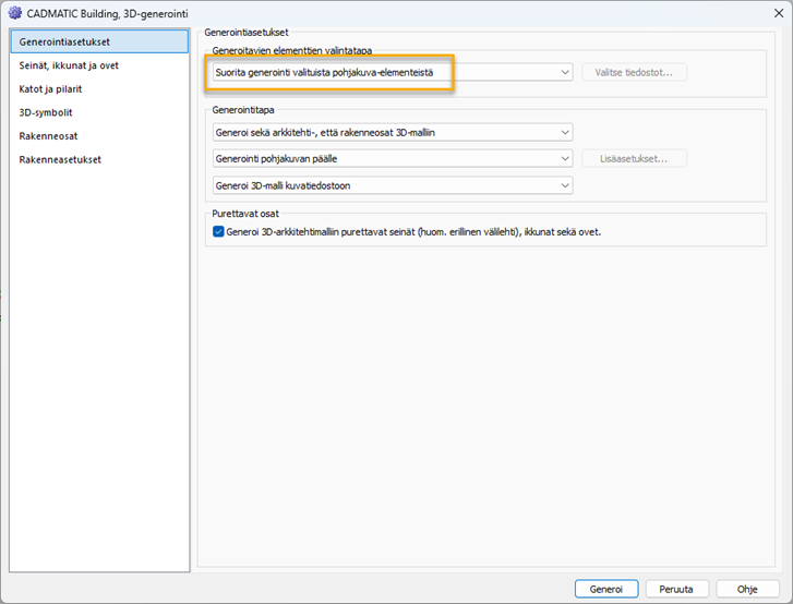 Aseta elementtien valintatavaksi Suorita generointi valituista pohjakuvaelementeistä.