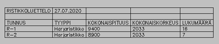 Edellisessä harjoituksessa luodut ristikot pohjakuvaan voidaan luetteloida, sekä niitä voi käyttää apuna luodessa ristikoiden tilauskaavioita.