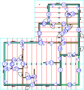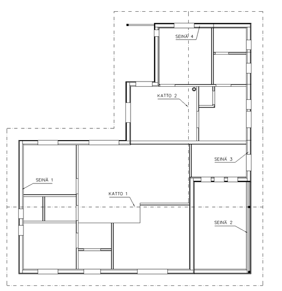 Koska pohjakuvassa väliseinät eivät yllä ulkoseinien runkoon asti, voit halutessasi ensin tehdä Apugeometria -toimintojen avulla muutamia apuviivoja pohjakuvaan.
