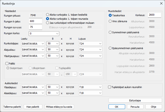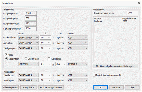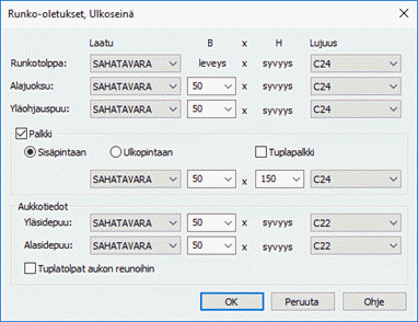 Tarkastetaan puutavaran koot ja materiaalit. Syötä arvot oheisen kuvan mukaisesti.