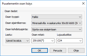 Puuelementtien muokkaus suoritetaan lomakkeella. Tiedot eivät siirry pohjakuvaseiniin.