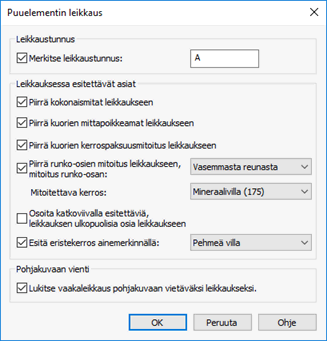 Puuelementin naamakuvasta voidaan luoda leikkauksia halutuista kohdista. Yksi vaakaleikkaus viedään lopuksi pohjakuvaan.