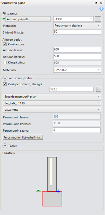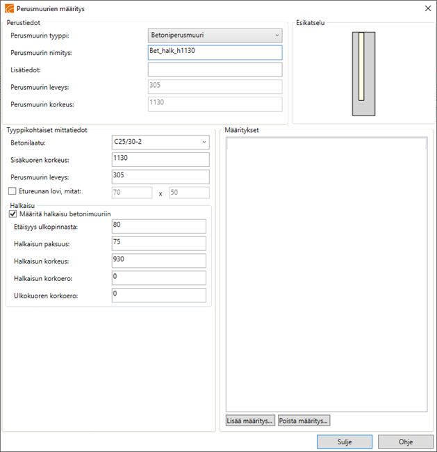 Käynnistä sama toiminto kuin yllä ja lisää uusi perusmuurimääritys mittojen osalta väliseinille kelpaaviksi (b=200, ei halkaisua). Piirtolinja muutetaan perusmuurin ulkopintaan sekä siirtymäksi syötetään 0.