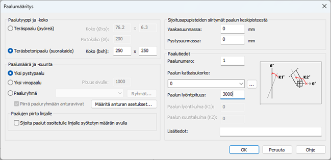 2. Syötä paalun tiedot dialogiin kuvan mukaan. Kuittaa OK.