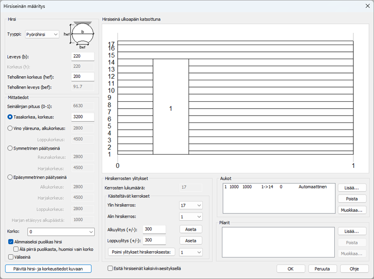Muokkaa haluttuja seinän tietoja. Mittatietojen päivittyminen esikatselukuvaan vaatii painikkeen Päivitä hirsi- ja korkeustiedot kuvaan painamista.