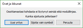 Mikäli ikkunan tai oven sijoitusvaiheessa osoitetaan kohtaan, jossa ei ole seinää, tulee ruudulle kysymys halutaanko ikkuna tai ovi sijoittaa symbolina kuvaan.