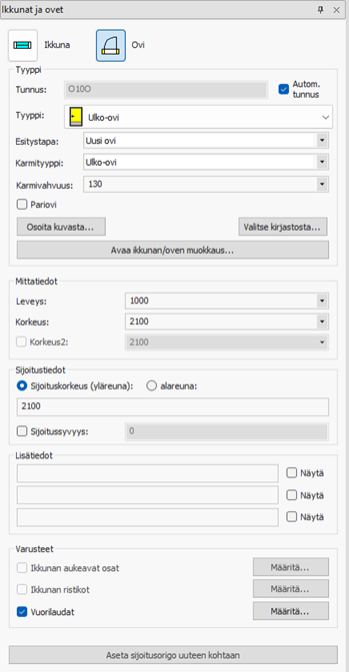 Tässä voidaan syöttää ikkunan tai oven sijoituskorkeus, sekä valita sijoitussyvyys elementille.