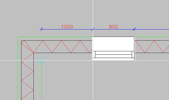 2. Sijoitettava ikkuna tai ovi tarttuu kiinni seinään ja origo (turkoosi ympyrä) siirtyy väliaikaisesti seinän lähimpään nurkkapisteeseen. Jos seinä osoitetaan jo olemassa olevan ikkunan/oven vierestä, origo sijoittuu ikkunan/oven reunaan.