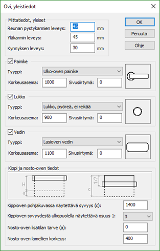 Yleismittatiedoissa syötetään oveen liittyviä lisämittoja. Täällä määritellään esimerkiksi painikkeiden, lukkojen ja vetimien asetukset, sekä kippi- ja nosto-ovien tiedot.