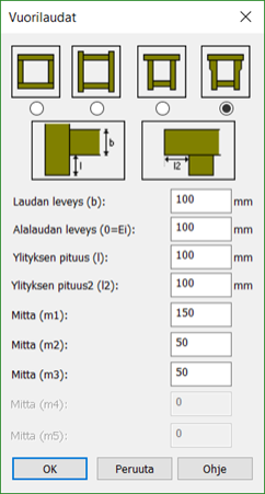 Vuorilaudat määritellään erillisessä dialogissa. Vuorilaudat näkyvät mm. julkisivukuvissa ja 3D-mallissa.