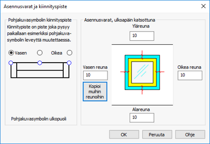 2. Syötä myös tarvittavat jokaisen sivun asennusvarat kenttiin. Painikkeella: Kopioi muihin reunoihin voidaan vasempaan reunaan syötetty arvo kopioida muihin reunoihin nopeasti.