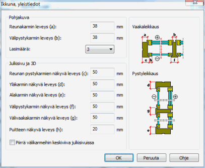 Yleismittatiedoissa syötetään ikkunaan liittyviä lisämittoja. Täällä määritellään esimerkiksi karmien esitystapa leikkauksissa, julkisivuissa ja 3D-mallissa.