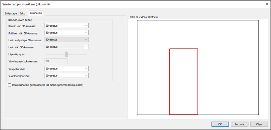 Valitse ikkunan lasin esitystapa. Vaihtoehto 3D-asetus tarkoittaa sitä, että tietoa ei kirjata pohjakuvaelementille, vaan tieto määrätään asetuksilla.