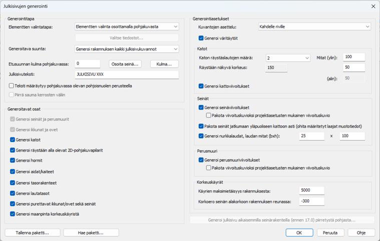 Julkisivugeneroinnin asetukset määritellään dialogissa.