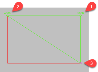 Osoita kaksi muuta pistettä (kuvassa nrot 2 ja 3) ja syötä niille korot. Lape kallistetaan kolmen pisteen suhteen niin, että harjapiste on ylin kohta lappeesta.