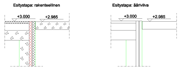 - Kerrosrajauksia käytettäessä voidaan leikkauslinjat siirtää eri kohtiin eri kerroksissa, jolloin saadaan esim. jokaisessa kerroksessa seinän kohdalle osumaan ikkuna.