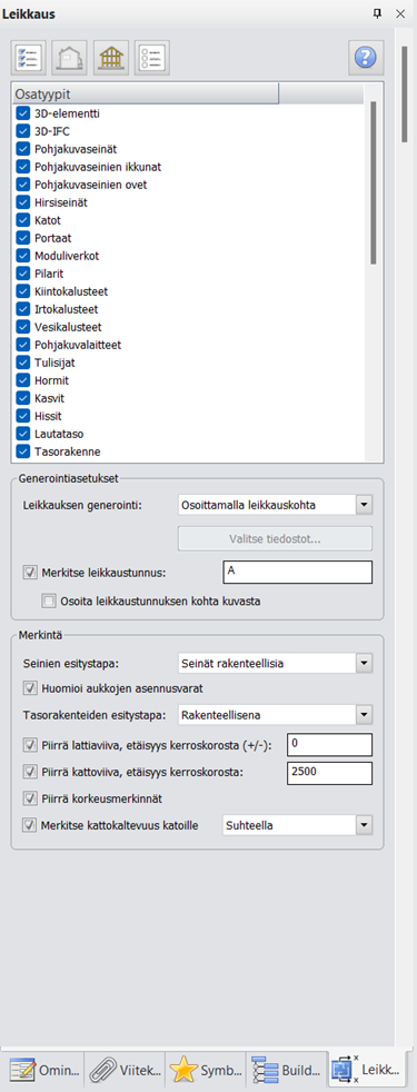Leikkauksen asetukset määritellään ikkunassa. Generointi on mahdollista suorittaa 2D- tai 3D-kuvasta ja leikkauslinja voi olla myös vinossa taloon nähden.