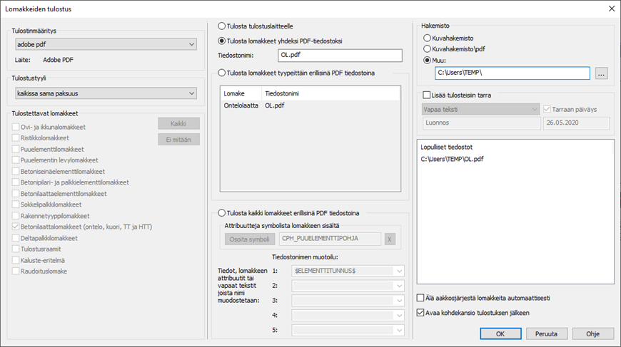 Huom! Betoni- ja puuelementit, joissa yhdellä elementillä voi olla useita lomakkeita toimitaan niin, että saman elementin eri lehdet tulostetaan samaan pdf-tiedostoon.