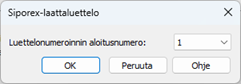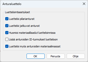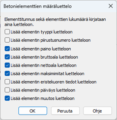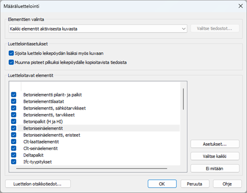 Määräluetteloinnin asetuksia muutetaan luettelointidialogissa. Lisäksi dialogissa voidaan muokata joidenkin rakennusosien poikkeavia asetuksia.