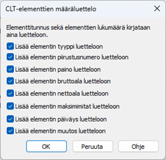 Valitse muunnetaanko leikepöydälle sijoitettavan luettelon pisteet pilkuiksi. Tämä on tärkeää silloin, kun leikepöydältä luettelo liitetään esimerkiksi suomenkieliseen Exceliin, jossa pilkku toimii desimaalierottimena. Piste muuttaa arvot herkästi päivämääriksi.