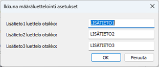 Lisätietokenttien otsikot syötetään asetuksissa.