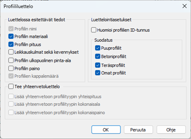 Valitse luettelossa esitettävät tiedot. Pakolliset tiedot ovat profiilin nimi sekä -kappalemäärä. Vaikka kaikkia tietoja ei näytettäisikään luettelossa vaikuttaa ne luonnollisesti kuitenkin luettelon muodostumiseen (eli eri mittaiset profiilit listataan kaikki erikseen, vaikkei pituutta kirjattaisikaan luetteloon).