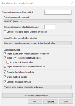 Valitse luetteloon kirjattavat luettelon osiot. Levy- ja eristetiedoissa valitse huomioidaanko aukot.