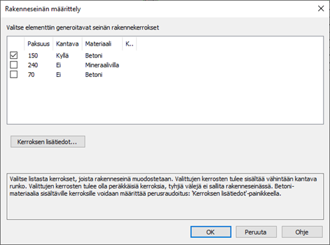 Valitse dialogista kerrokset, jotka huomioidaan rakenneseinänä.