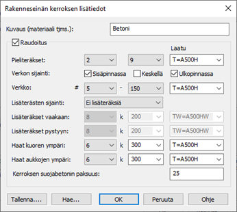 Dialogissa voidaan myös lisätä betoniosiin perusraudoitukset.