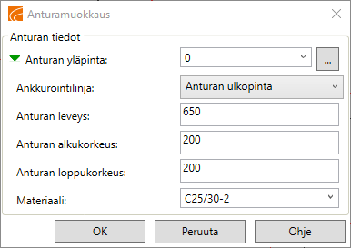 Syötä anturan yläpinnan korko. Koron voi poimia myös pohjakuvasta.