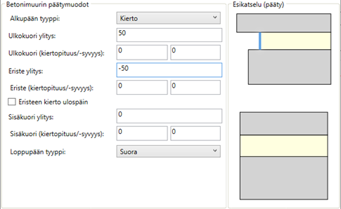 Valitse alku- ja loppupään tyyppi. Syötä tarvittaessa mittatiedot.