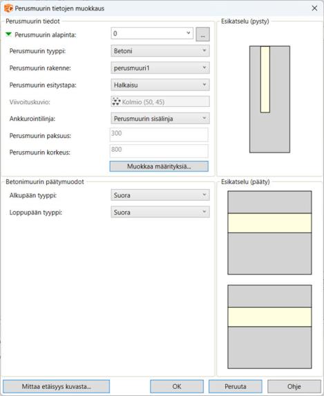 Valitse perusmuurin tyyppi, rakenne ja esitystapa. Muokkaa tarvittaessa määrityksiä. Katso määrityksen lisäohjeita täältä: Jatkuva perustus.