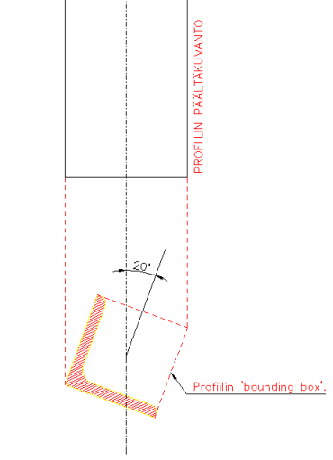 Huom! Profiili piirretään pohjakuvaan osoituslinjan mukaan, joten esimerkiksi profiilin päiden katkaisukulmat (näkymättömät katkaisukulmat) eivät näy tasokuvassa. Tämä tulee vastaan erityisesti vinoon piirretyissä profiileissa. Tämän vuoksi on hyvä tarkastaa monimutkaisempia suunnitelmia 3D-generointitoimintojen avulla.