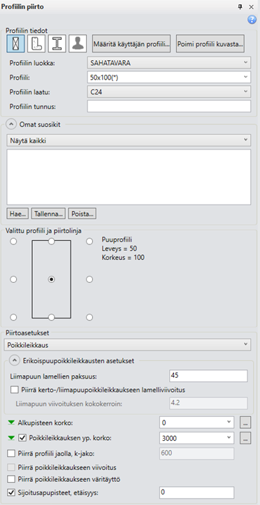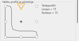 Kun piirrettävän profiilin tiedot on valittu (joko valitsemalla profiilin tiedot tai valitsemalla profiili Omat suosikit-luettelosta) näytetään valitun profiilin poikkileikkaus. Poikkileikkauksesta voidaan valita profiilin sijoituspiste (katsottuna alkupisteestä loppupisteeseen).