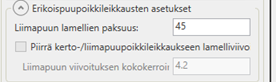 Erikoispuupoikkileikkausten asetuksista muokataan liimapuupoikkileikkauksien ulkonäköä. Lamellien paksuus ja viivoituksen kokokerroin on vapaasti valittavissa.