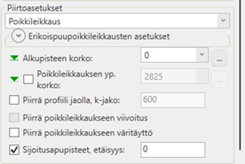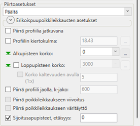 Huom! Profiilin piirtolinja on samalla profiilin korkeusasema eli jos profiili piirretään keskilinjan mukaisesti ja koroksi määritellään 2500 mm on tällöin profiilin keskilinja 2500 mm:n korkeudella. Jos profiili halutaan piirtää eri korkoon, kuin itse osoituslinja, pitää korkoarvo laskea itse.