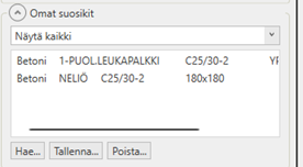 Suodattimen avulla voidaan listasta suodattaa vain tietyn materiaalin profiilit (kaikki, puu-, betoni-, teräs- ja omat profiilit).