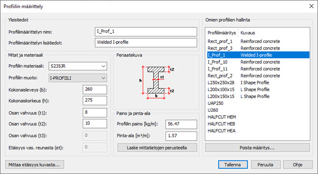 Syötä profiilin mittatiedot kenttiin. Viereinen periaatekuva esittää profiilin mitat, mutta ei muutu tietojen mukaan.
