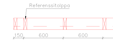 Tolppajako referenssitolpan perusteella: Syötä referenssitolpan etäisyys runkolinjan alkupisteestä. Etäisyys voi olla myös negatiivinen. Apuna etäisyyden määrittelyssä voi käyttää Mittaa etäisyys -painiketta. Kuvassa referenssitolpan etäisyydeksi on annettu 150 mm.