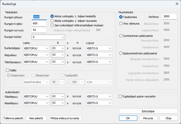 Tallenna- ja Hae paketti -toiminnoilla voidaan rungon materiaali ja palkkitiedot tallentaa levylle. Tallennustoiminnot eivät tallenna muototietoja eikä rungon k-jakoa tai -syvyyttä.