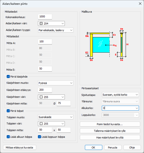 Aidan tai kaiteen tiedot määritetään erilaisilla mittatiedoilla, joiden määrä riippuu hieman valitusta mallista. Lisäksi aitaan voidaan valita käsijohteiden piirto tai tolppien piirto.