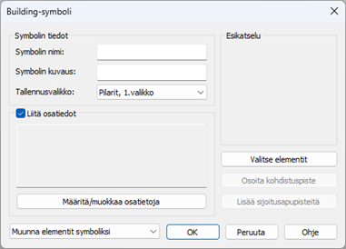 Valitse lisätäänkö symboliin osatietoja. Symbolille kirjautuvat osatiedot näkyvät ikkunassa. Osatiedot voidaan poistaa poistamalla ruksi kohdasta Liitä osatiedot - tällöin tietoja ei kirjata, vaikka ne olisikin määritetty ikkunaan. Symboliin määritettävät osatiedot poikkeavat hieman Määritä osatiedot-toiminnoilla määritetyistä osatiedoista. Symbolin osatietoja ei voi poistaa tai muokata Muokkaa osatietoja-toiminnoilla. Lisää tietoja voi määritellä kyseisillä toiminnoilla ja jälkikäteen lisättyjä tietoja voi poistaa.