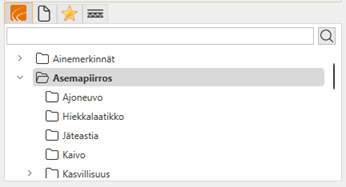Etsi listasta sopiva valikko. Kun valikkoa napsauttaa, näkyy Symbolit-kentässä sen sisältämät symbolit. Hakukenttä auttaa oikean symbolin löytämisessä. Kirjoita esim. auto ja napsauta  (Etsi)-painiketta, jolloin hakusanaan sopivat symbolit etsitään. (Etsi)-painiketta, jolloin hakusanaan sopivat symbolit etsitään.