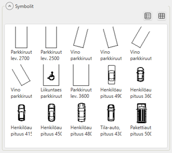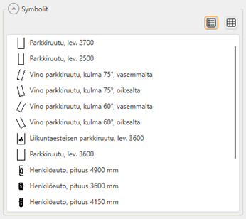 Napsauta haluttua symbolia kerran, jos haluat muokata sen piirtoasetuksia. Jos haluat sijoittaa symbolin heti, se onnistuu tuplanapsautuksella. Symbolit voidaan esittää ikkunassa ruutumaisessa tai listamaisessa muodossa. Listan muotoa voidaan vaihtaa oikean yläkulman kuvakkeista.  Näytä/piilota kuva Näytä/piilota kuvaRiviluettelo Kuvakeluettelo