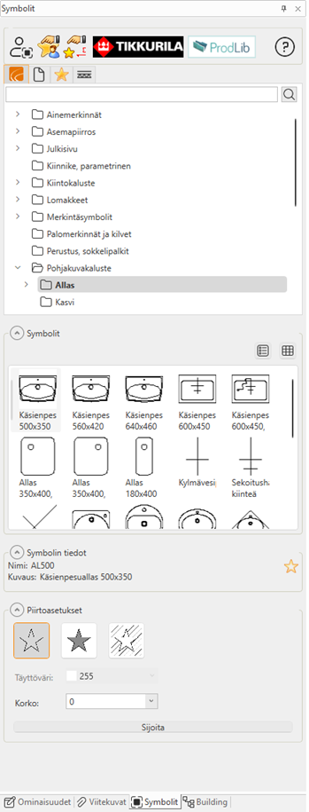 |   | Building-sovellus > Arkkitehti-välilehti > Pohjakuvasymbolit-ryhmä > Symbolit, SYMBOLIVALINTA |