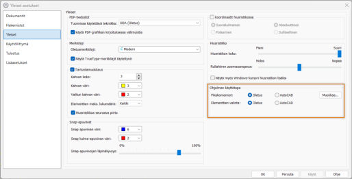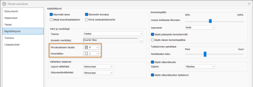 Yleiset-välilehdellä on asetuksia, jotka liittyvät fontteihin, pikakomentoihin ja elementtien valintaan.