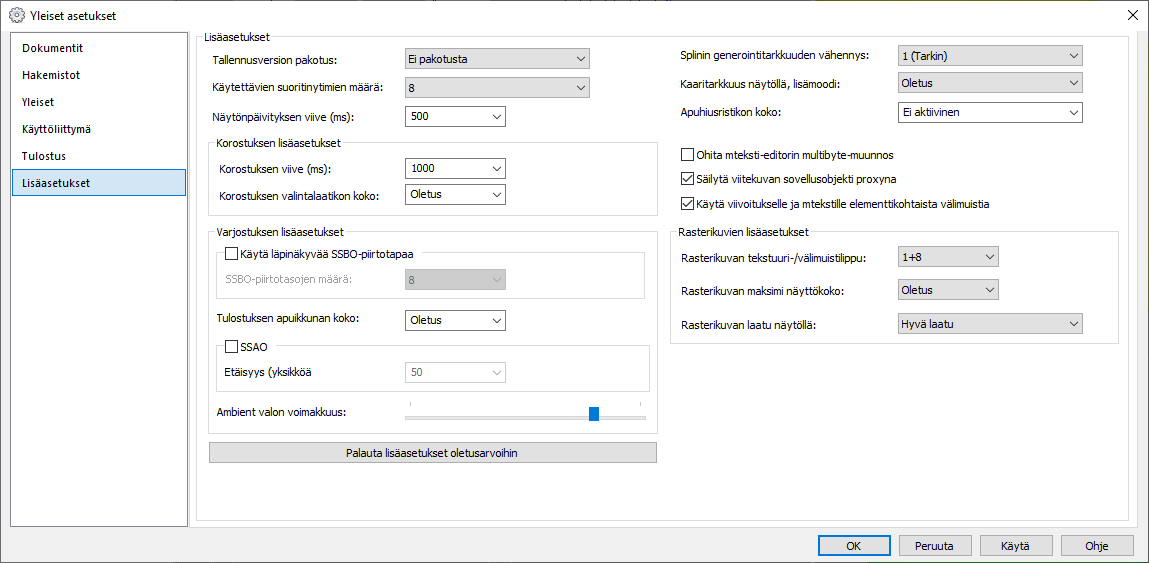 Näissä asetuksissa voit määritellä ohjelman suorituskykyyn ja yhteensopivuuteen liittyviä asetuksia.